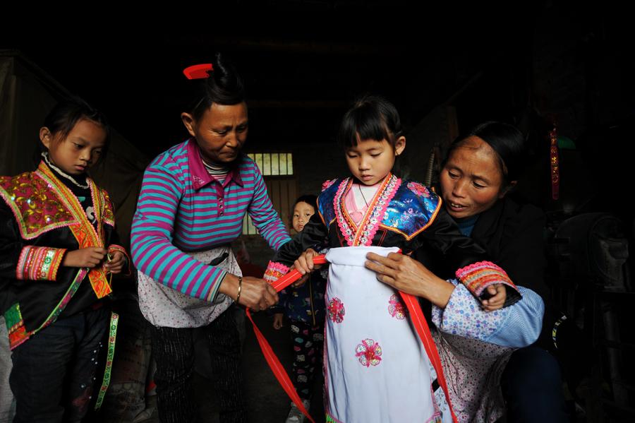 This photo taken on April 22, 2018 shows Ji Xue wearing new clothes of Miao ethnic group, before heading to new home, at Longtan Village in Xixiu District of Anshun City, southwest China's Guizhou Province. (Xinhua/Yang Wenbin)