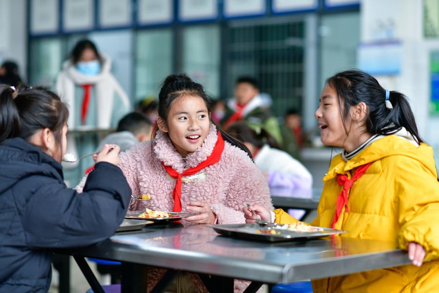 Ji Xue (C) has free lunch at school in Xixiu District of Anshun City, southwest China's Guizhou Province, Dec. 22, 2023. (Xinhua/Yang Wenbin)