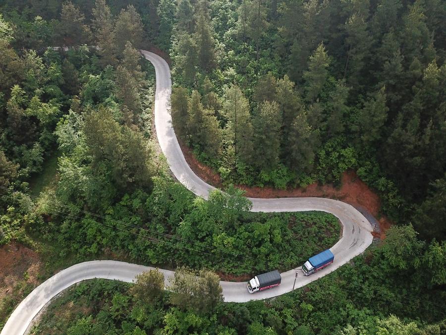 This photo taken on April 22, 2018 shows trucks loaded with Ji Xue's family belongings heading to their new home in Xixiu District of Anshun City, southwest China's Guizhou Province. (Xinhua/Yang Wenbin)