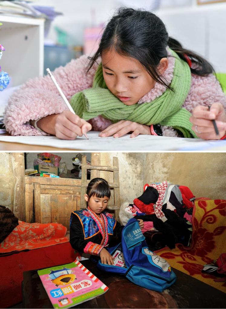 This combo photo shows Ji Xue practising drawing (above) at school in Xixiu District of Anshun City, southwest China's Guizhou Province, Dec. 22, 2023 and Ji Xue packing school bag at Longtan Village in Xixiu District on April 21, 2018. (Xinhua/Yang Wenbin)