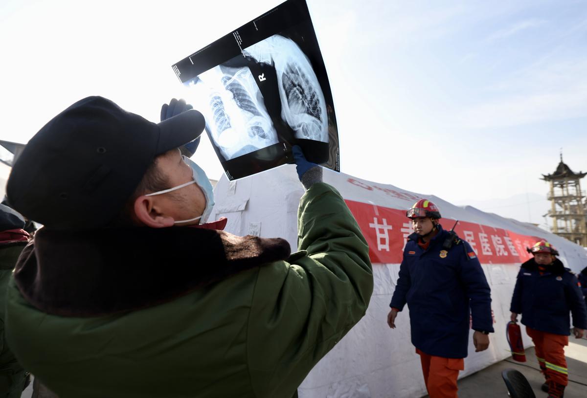 A doctor checks X-ray films on Thursday at a resettlement site in Jishishan county, Gansu Province. A medical aid team from the Gansu Provincial Hospital are treating the quake-affected people at a mobile field hospital which is capable of carrying out CT scans, laboratory tests and surgeries. WEI XIAOHAO / CHINA DAILY
