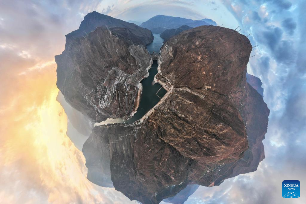 This aerial panoramic photo taken on Dec. 22, 2023 shows the Wudongde hydropower station on the border of Sichuan and Yunnan provinces in southwest China. Wudongde hydropower station is a major national project to implement China's west-to-east power transmission program. (Xinhua/Hu Chao)