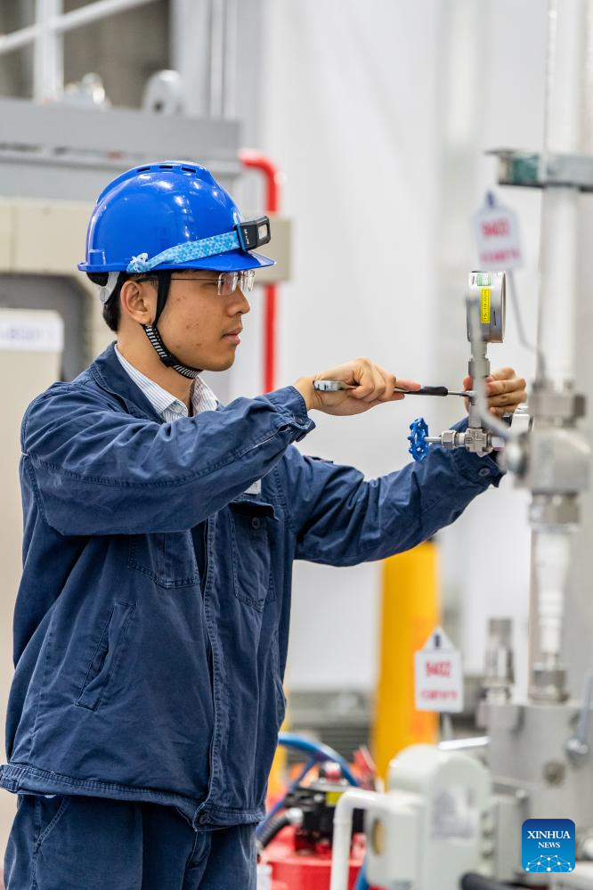 A staff member works at the Wudongde hydropower station on the border of Sichuan and Yunnan provinces in southwest China, Dec. 22, 2023. Wudongde hydropower station is a major national project to implement China's west-to-east power transmission program. (Xinhua/Hu Chao)