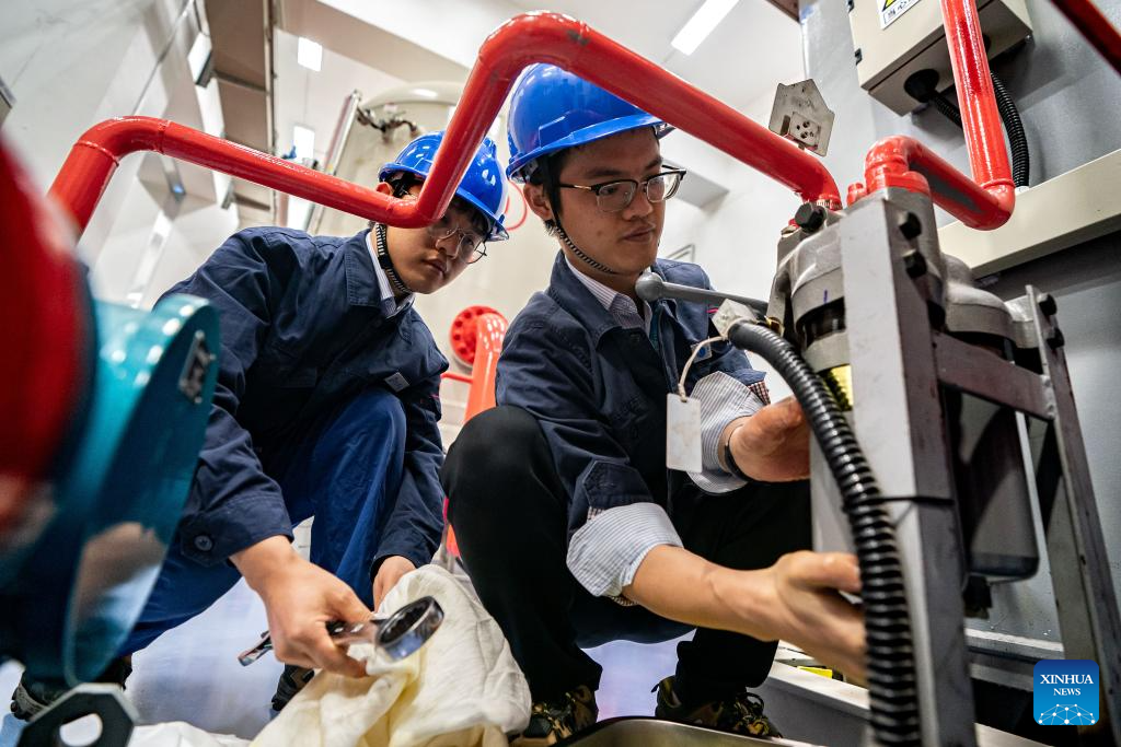 Staff members work at the Wudongde hydropower station on the border of Sichuan and Yunnan provinces in southwest China, Dec. 22, 2023. Wudongde hydropower station is a major national project to implement China's west-to-east power transmission program. (Xinhua/Hu Chao)