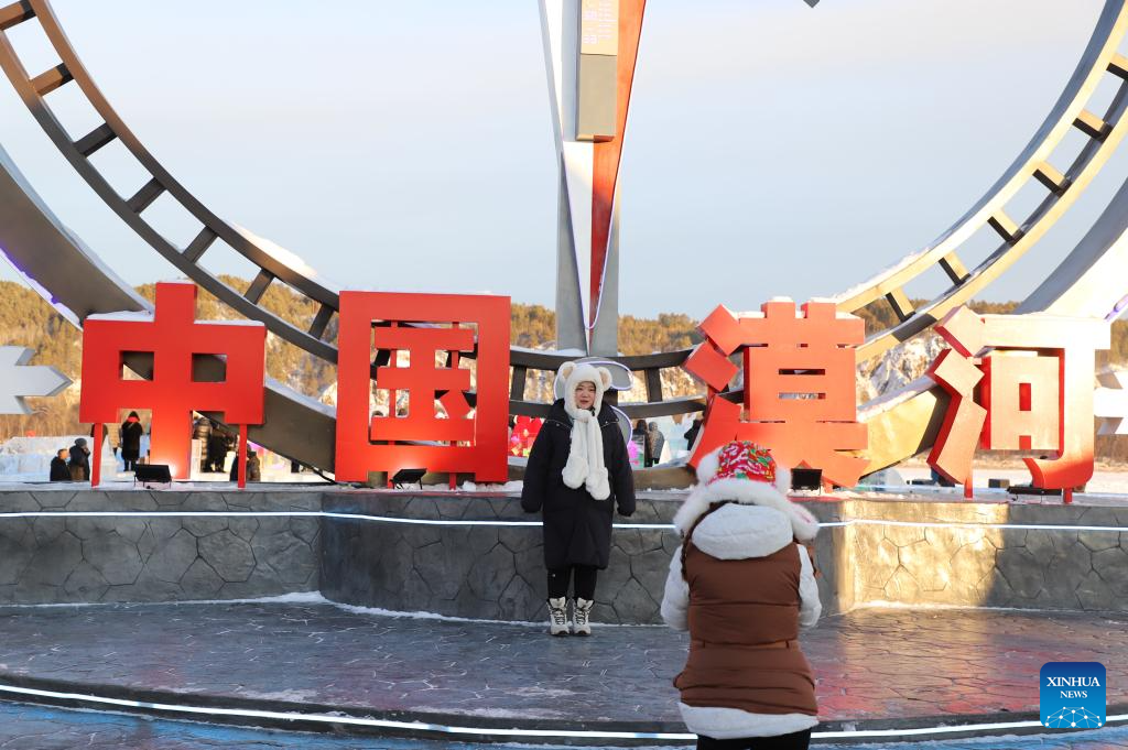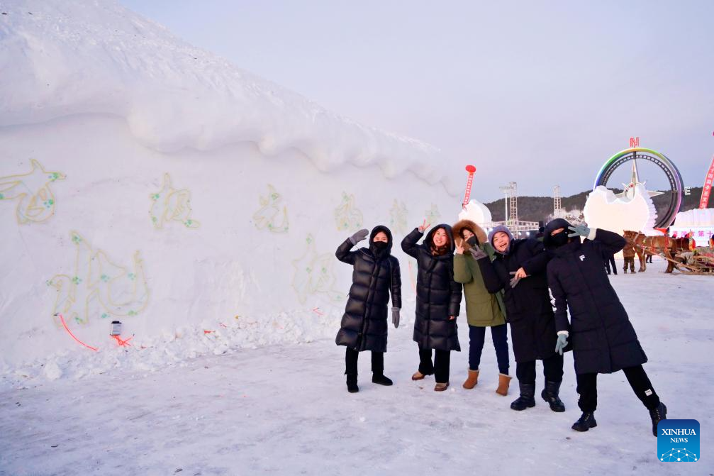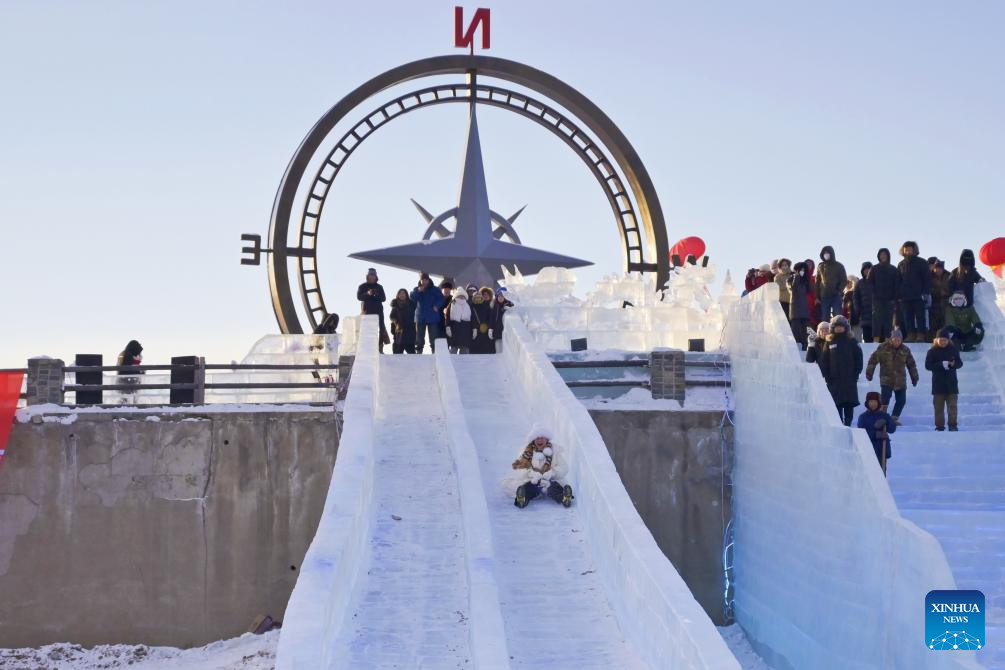 Visitors have fun at a square in Beiji Village of Mohe, northeast China's Heilongjiang Province, Dec. 22, 2023. Known as China's "North Pole," Mohe has developed a variety of winter tourism programs in recent years, attracting tourists to experience an "extremely cold journey." (Xinhua/Shi Feng)