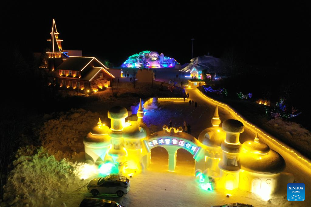 This aerial photo taken on Dec. 20, 2023 shows a view of an ice and snow park in Beiji Village of Mohe, northeast China's Heilongjiang Province. Known as China's "North Pole," Mohe has developed a variety of winter tourism programs in recent years, attracting tourists to experience an "extremely cold journey." (Xinhua/Shi Feng)