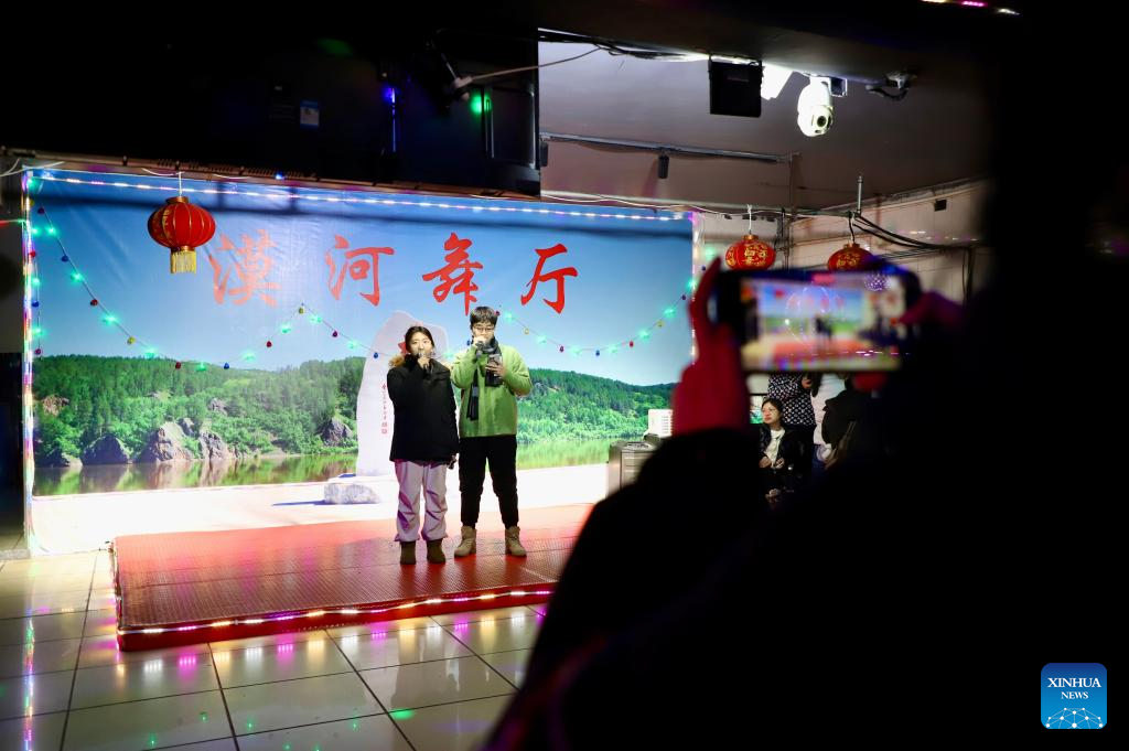 Visitors sing songs in Beiji Village of Mohe, northeast China's Heilongjiang Province, Dec. 20, 2023. Known as China's "North Pole," Mohe has developed a variety of winter tourism programs in recent years, attracting tourists to experience an "extremely cold journey." (Xinhua/Xu Kaixin)