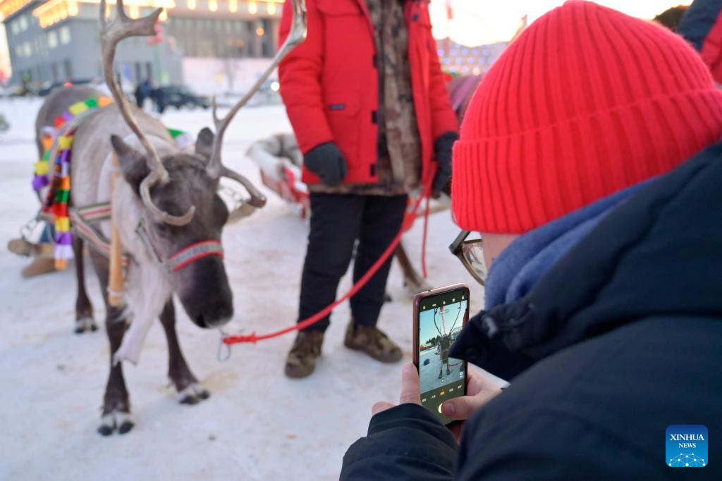 A visitor takes photos of a reindeer in Beiji Village of Mohe, northeast China's Heilongjiang Province, Dec. 22, 2023. Known as China's "North Pole," Mohe has developed a variety of winter tourism programs in recent years, attracting tourists to experience an "extremely cold journey." (Xinhua/Shi Feng)