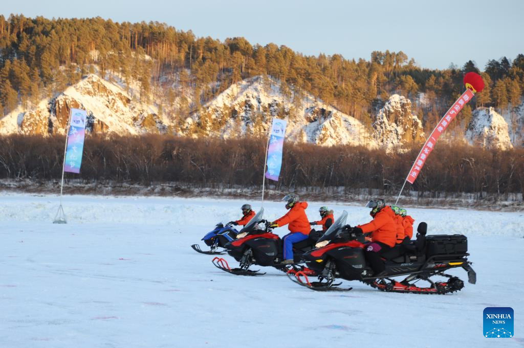 Visitors experience motorcycle riding on snow in Beiji Village of Mohe, northeast China's Heilongjiang Province, Dec. 22, 2023. Known as China's "North Pole," Mohe has developed a variety of winter tourism programs in recent years, attracting tourists to experience an "extremely cold journey." (Xinhua/Jin Di)