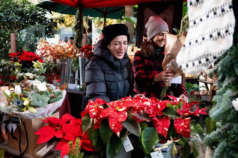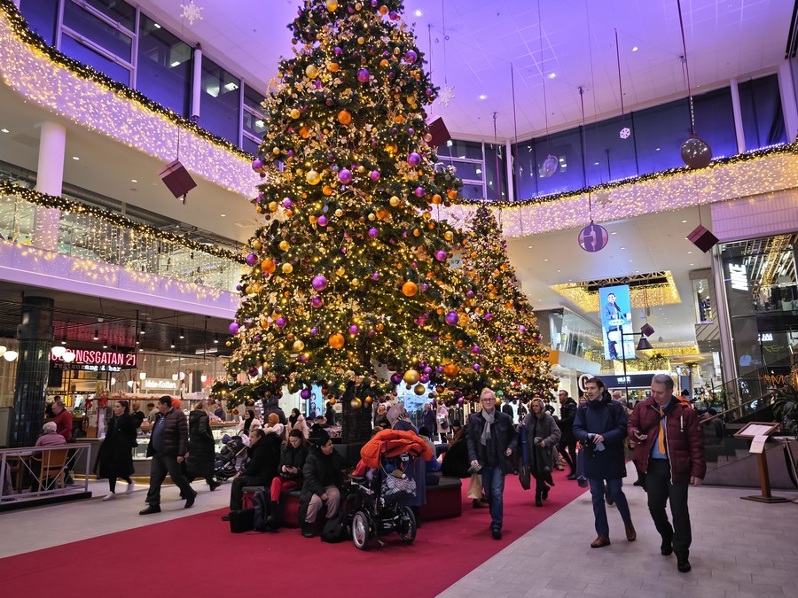 People are seen at a shopping mall in Stockholm, Sweden, on Dec. 7, 2023. (Photo by Wei Xuechao/Xinhua)