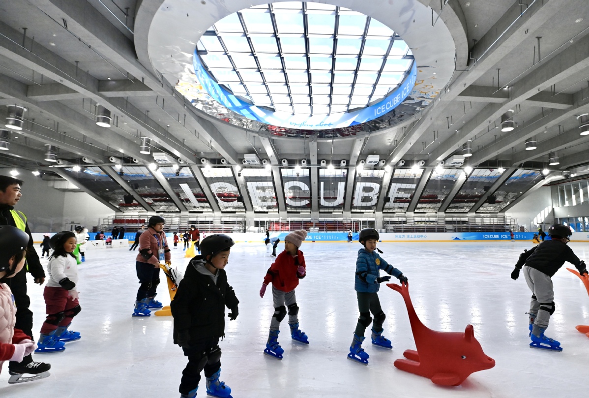Tourists experience ice sports during the first anniversary of the Winter Olympics at the "Ice Cube" in Beijing on Feb 4, 2023. [Photo by Wei Xiaohao/chinadaily.com.cn]