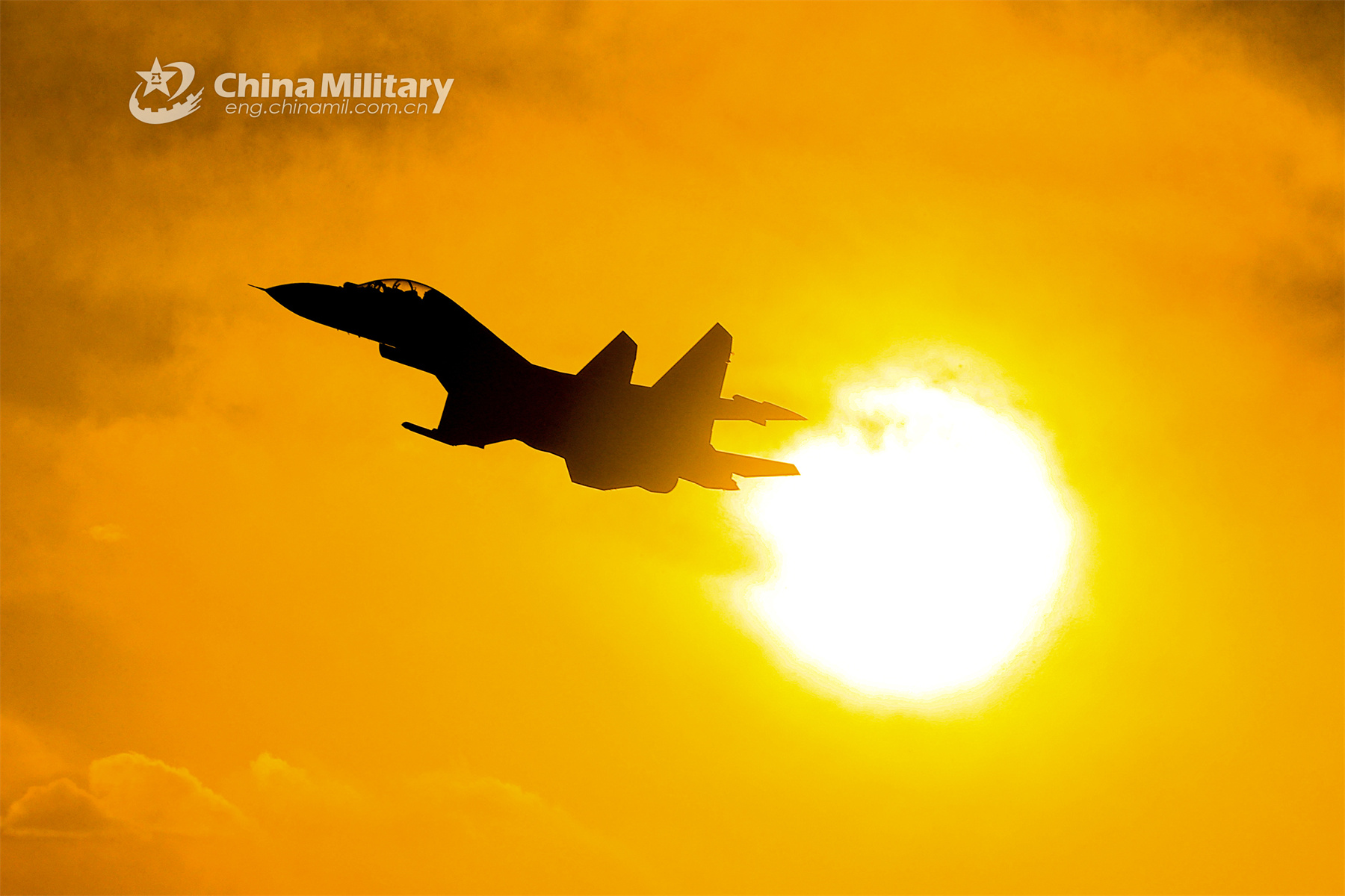 A fighter jet attached to a brigade of the PLA Air Force Xi'an Flying College soars into the sky at sunset during a flight training exercise in early December, 2023. (eng.chinamil.com.cn/Photo by Cui Baoliang)