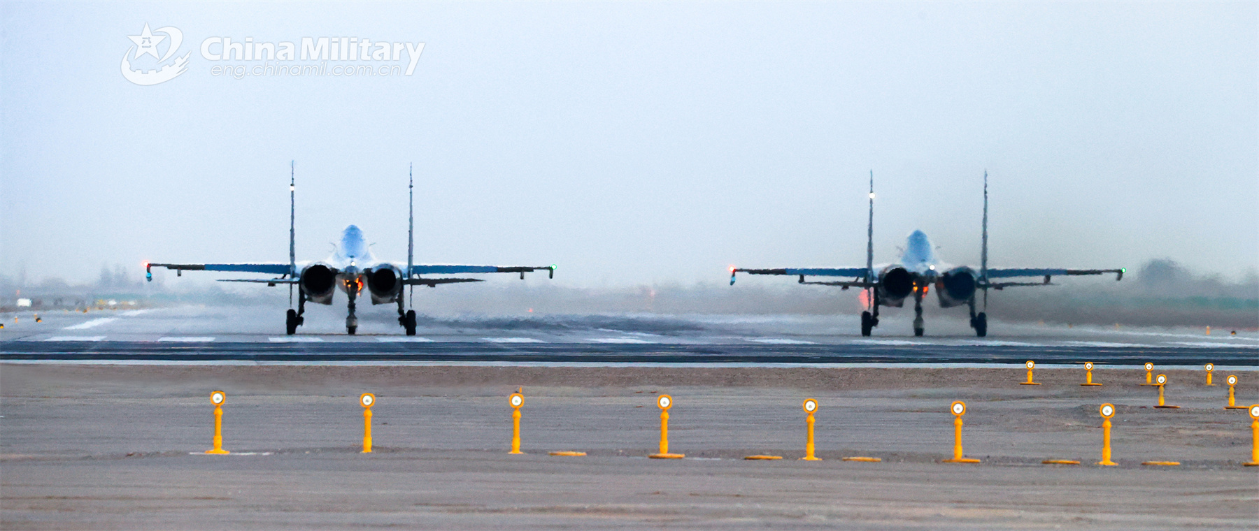 Fighter jets attached to a brigade of the PLA Air Force Xi'an Flying College taxi on the runway before takeoff during a flight training exercise in early December, 2023. (eng.chinamil.com.cn/Photo by Cui Baoliang)