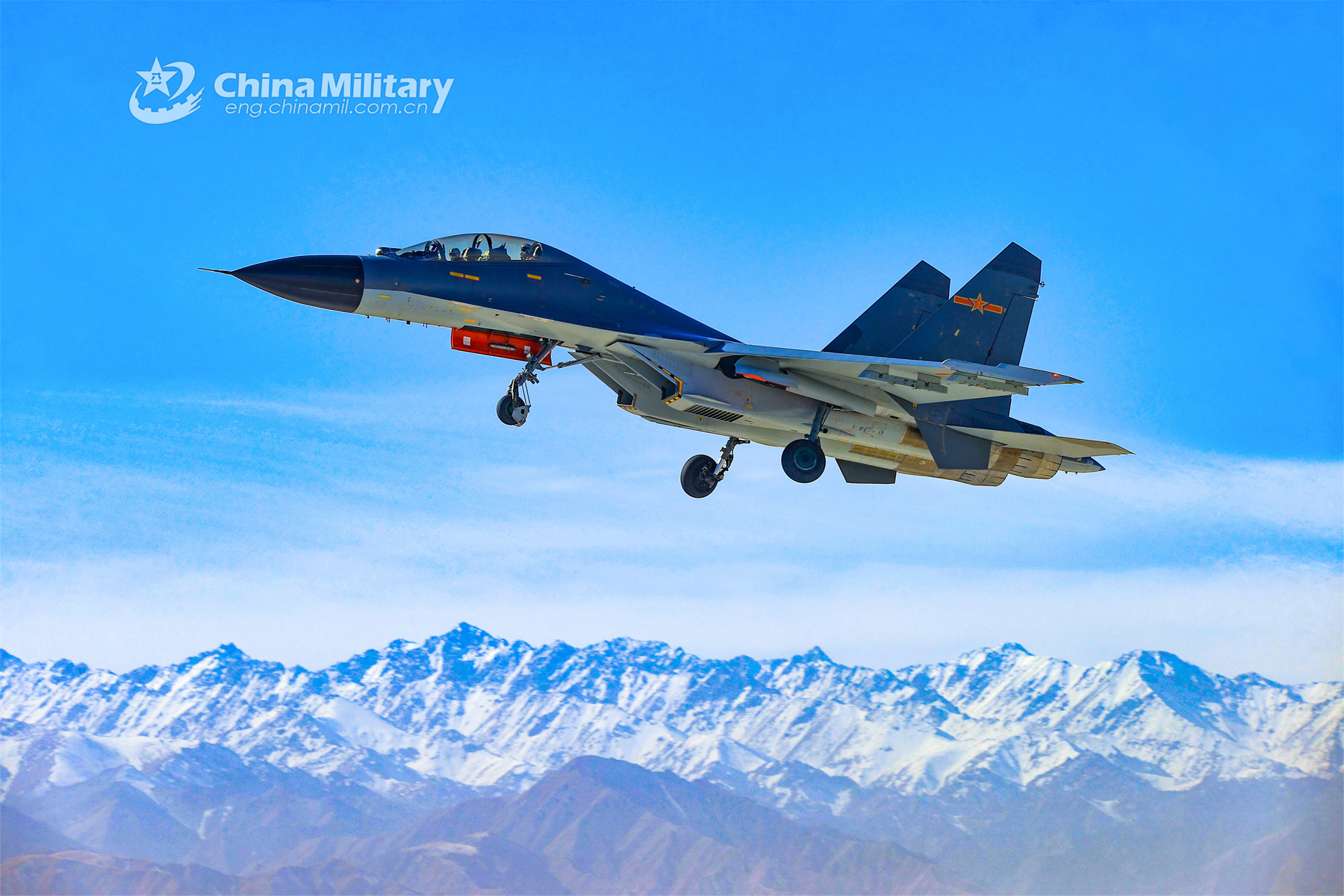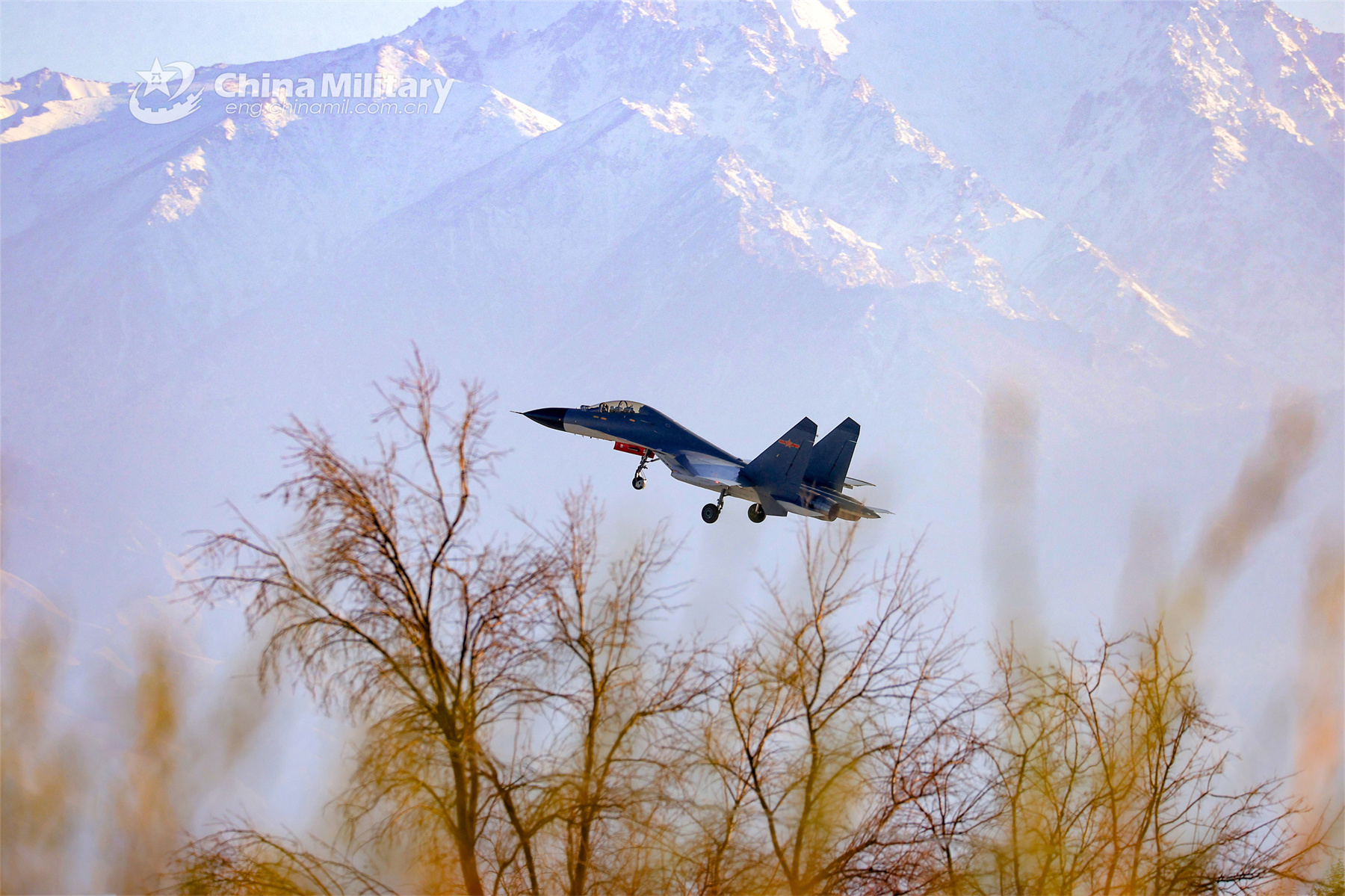 A fighter jet attached to a brigade of the PLA Air Force Xi'an Flying College flies over snow-clad mountains during a flight training exercise in early December, 2023. (eng.chinamil.com.cn/Photo by Cui Baoliang)