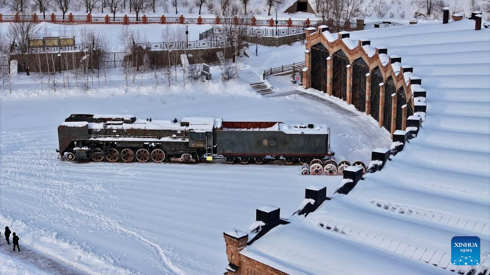 This aerial photo taken on Dec. 2, 2023 shows a demonstration area of a locomotive shed at the Chinese Eastern Railway museum in Hengdaohezi Town of Hailin City, northeast China's Heilongjiang Province. (Photo by Fan Junchen/Xinhua)
