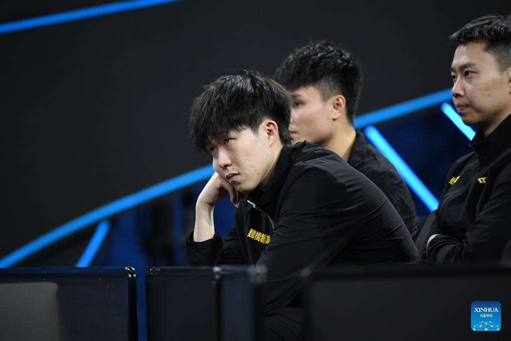 Wang Chuqin (L) of Shandong Weiqiao is seen during the men's team final match between Shandong Luneng and Shandong Weiqiao at the 2023 Chinese Table Tennis Super League (CTTSL) in Shenzhen, south China's Guangdong Province, Dec. 24, 2023. (Xinhua/Liang Xu)