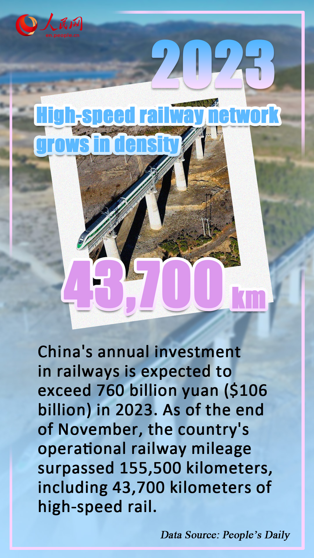 China's annual investment in railways is expected to exceed 760 billion yuan ($106 billion) in 2023. With an increasing number of projects reaching completion, more areas are gaining access to the railway network. As of the end of November, the country's operational railway mileage surpassed 155,500 kilometers, including 43,700 kilometers of high-speed rail.