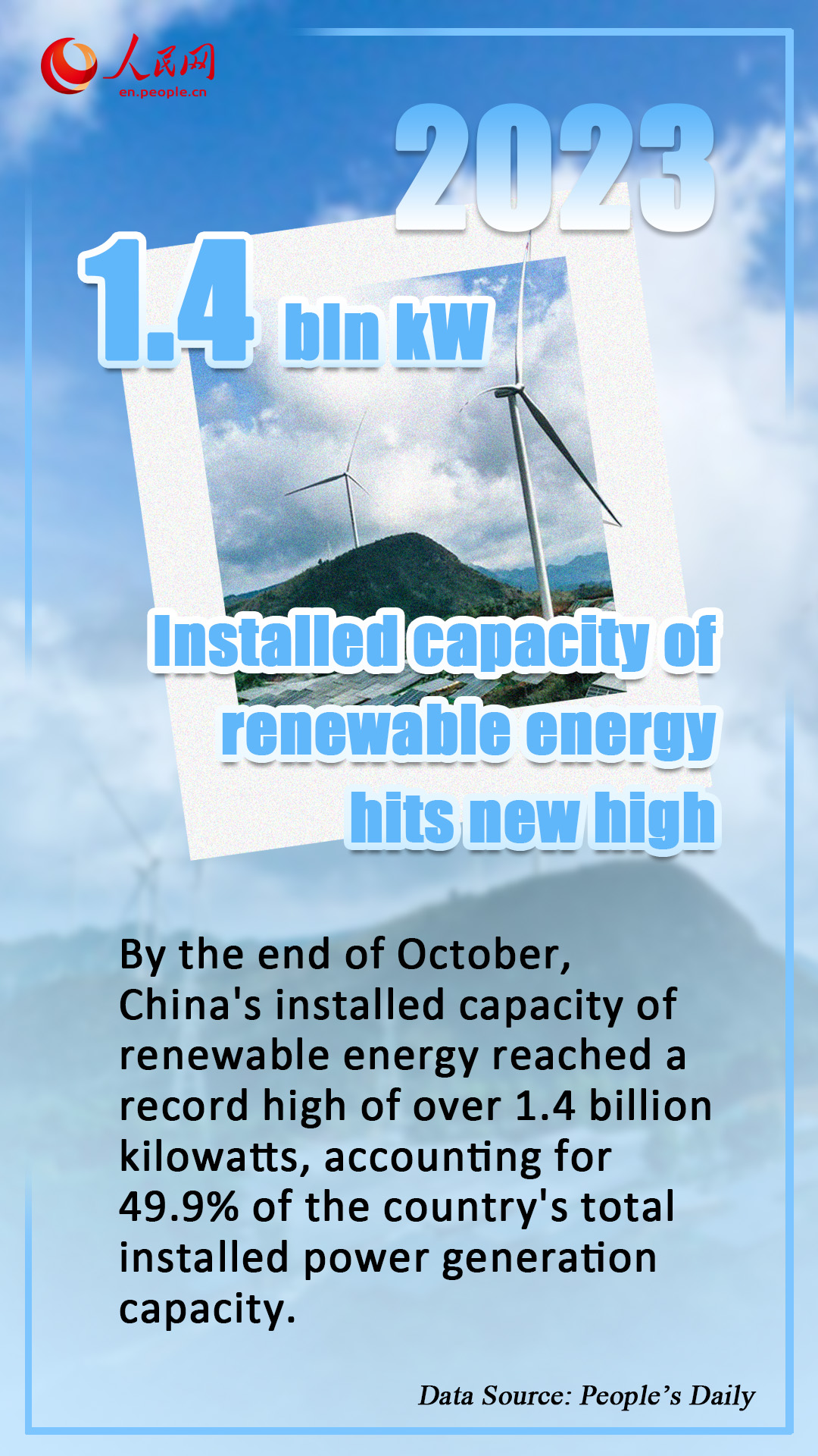 By the end of October, China's installed capacity of renewable energy reached a record high of over 1.4 billion kilowatts, accounting for 49.9 percent of the country's total installed power generation capacity. In 2023, photovoltaic power has become the country’s second-largest source of electricity in terms of installed capacity.