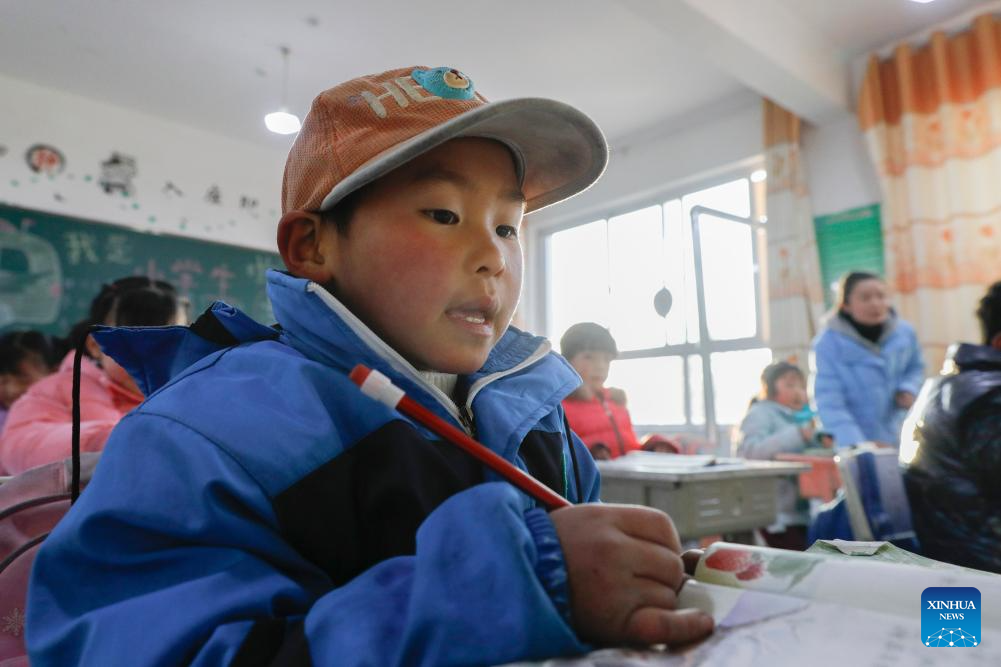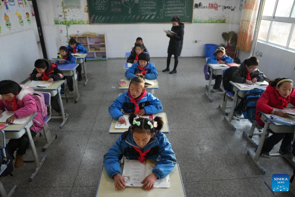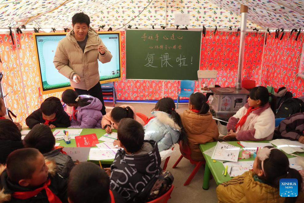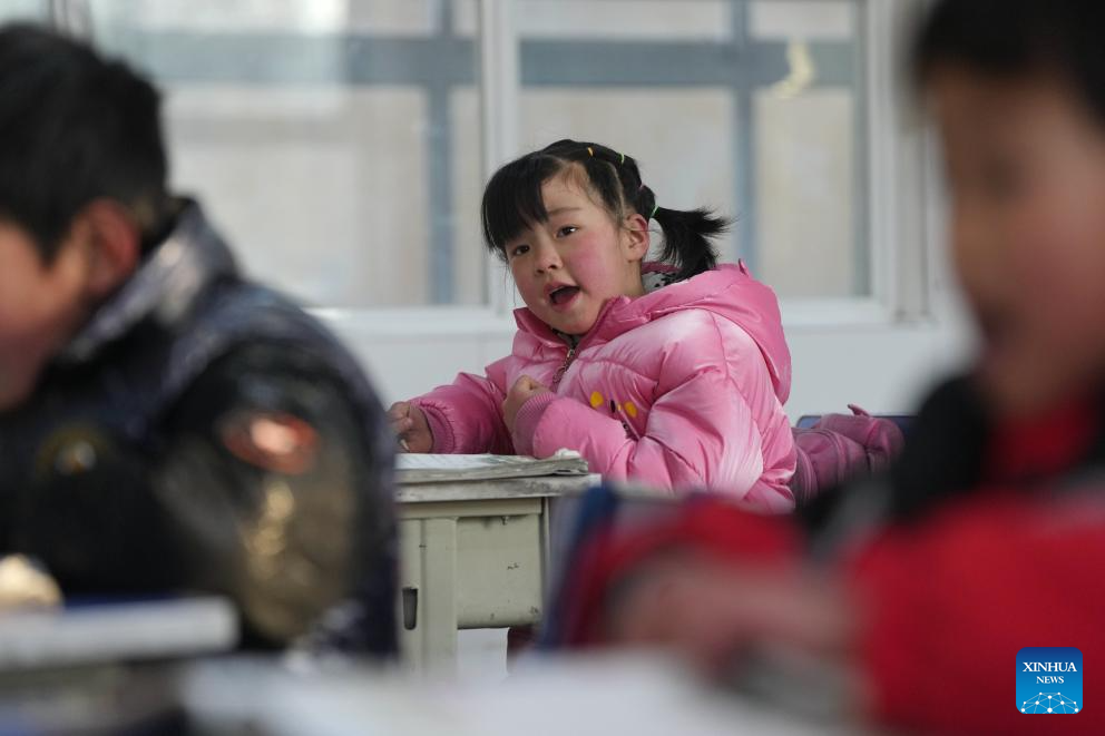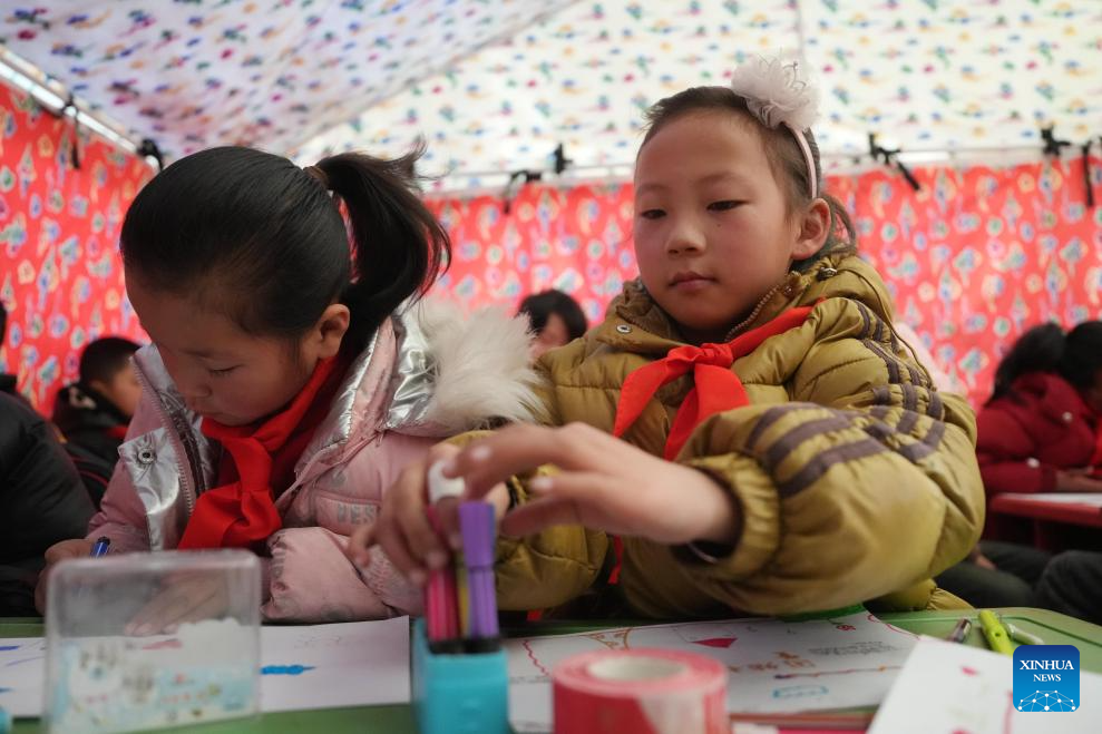 Students attend a class at a primary school in Liugou Township of Jishishan County, northwest China's Gansu Province, Dec. 25, 2023. Primary and secondary schools in the quake-hit areas of Jishishan started to resume classes on Monday after a safety check. (Xinhua/Fang Xin)