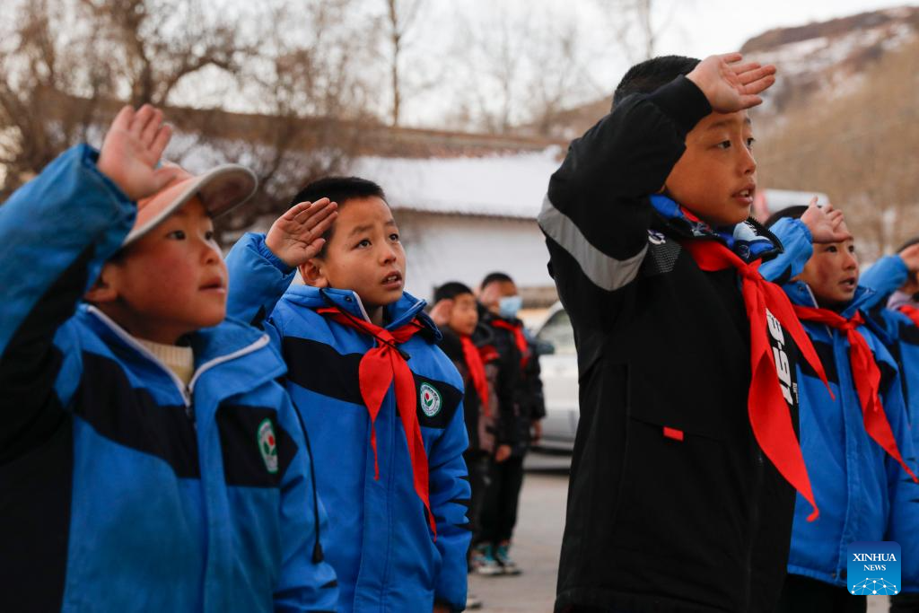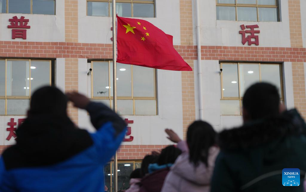 A flag-raising ceremony is held at a primary school in Liugou Township of Jishishan County, northwest China's Gansu Province, Dec. 25, 2023. Primary and secondary schools in the quake-hit areas of Jishishan started to resume classes on Monday after a safety check. (Xinhua/Chen Bin)