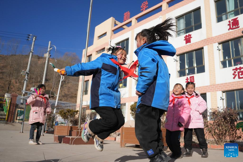 Students play games during a class break at a primary school in Liugou Township of Jishishan County, northwest China's Gansu Province, Dec. 25, 2023. Primary and secondary schools in the quake-hit areas of Jishishan started to resume classes on Monday after a safety check. (Xinhua/Chen Bin)