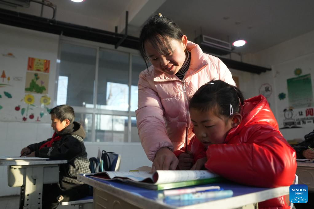 A teacher instructs a student at a primary school in Liugou Township of Jishishan County, northwest China's Gansu Province, Dec. 25, 2023. Primary and secondary schools in the quake-hit areas of Jishishan started to resume classes on Monday after a safety check. (Xinhua/Chen Bin)