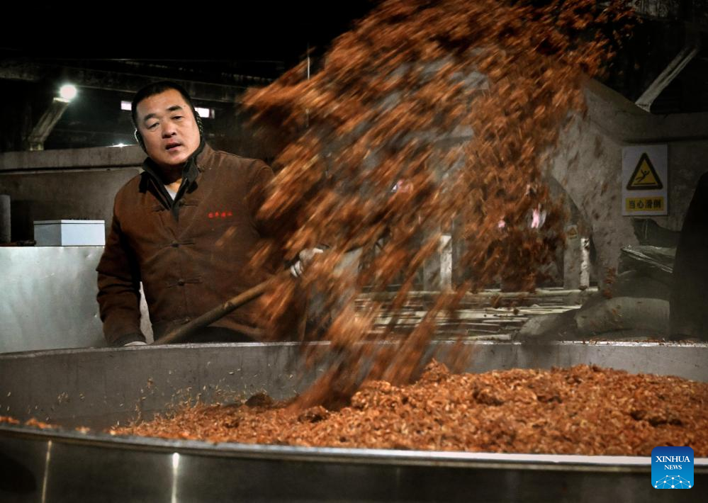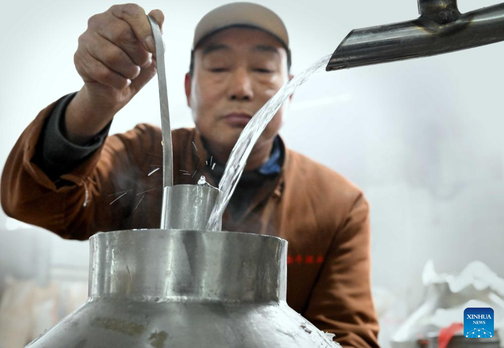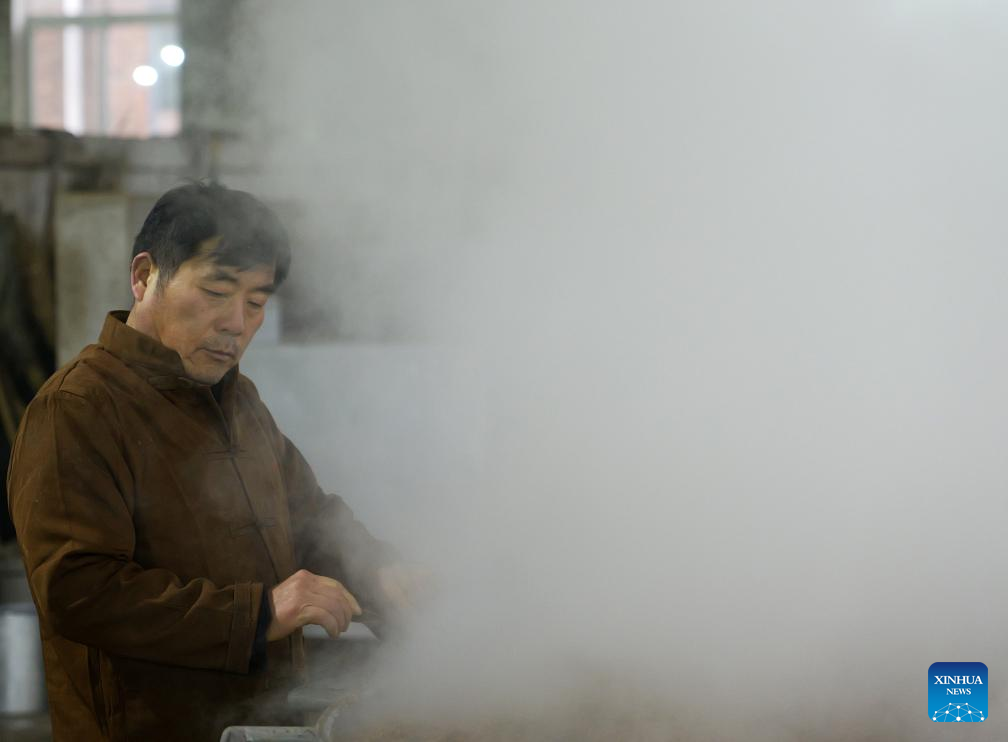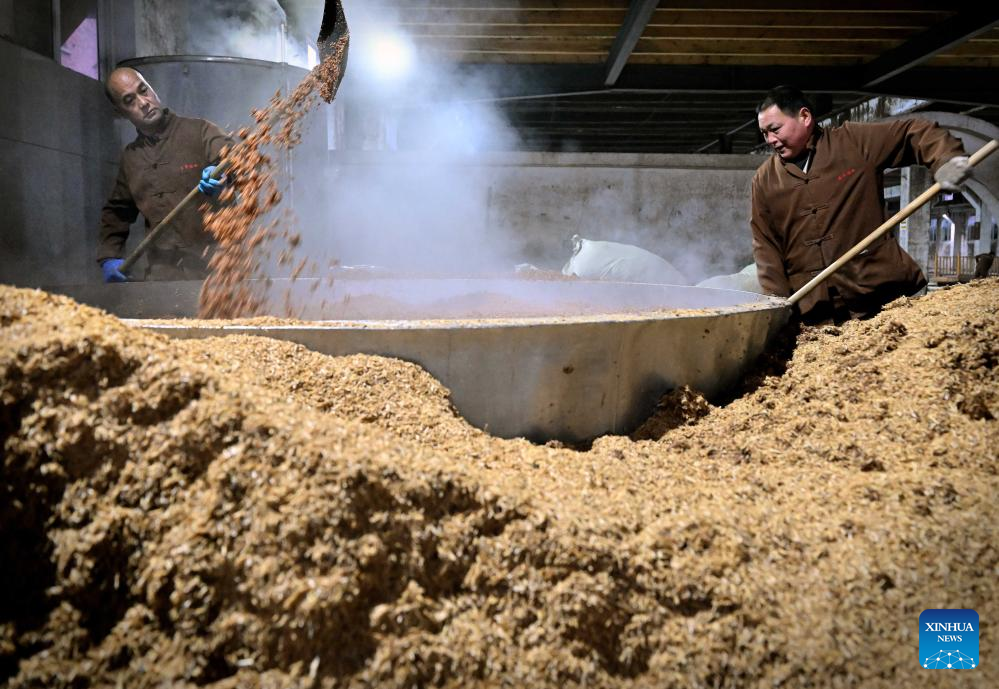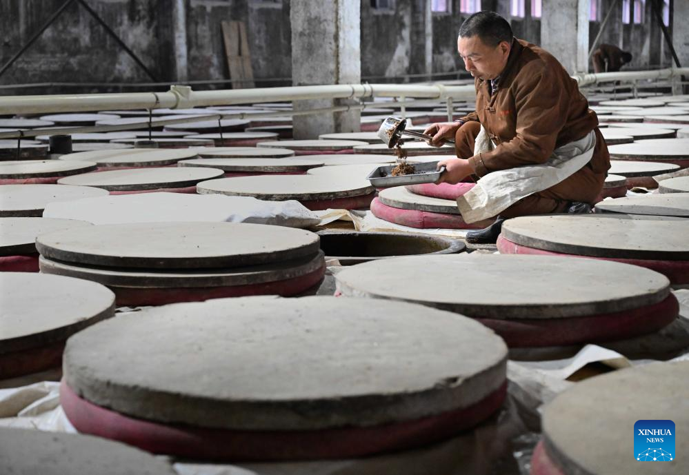 A worker puts the fermented unfiltered liquor into a pot for distillation at a workshop of Baofeng Baijiu Co., LTD in Baofeng County, central China's Henan Province, Dec. 21, 2023. (Xinhua/Li An)