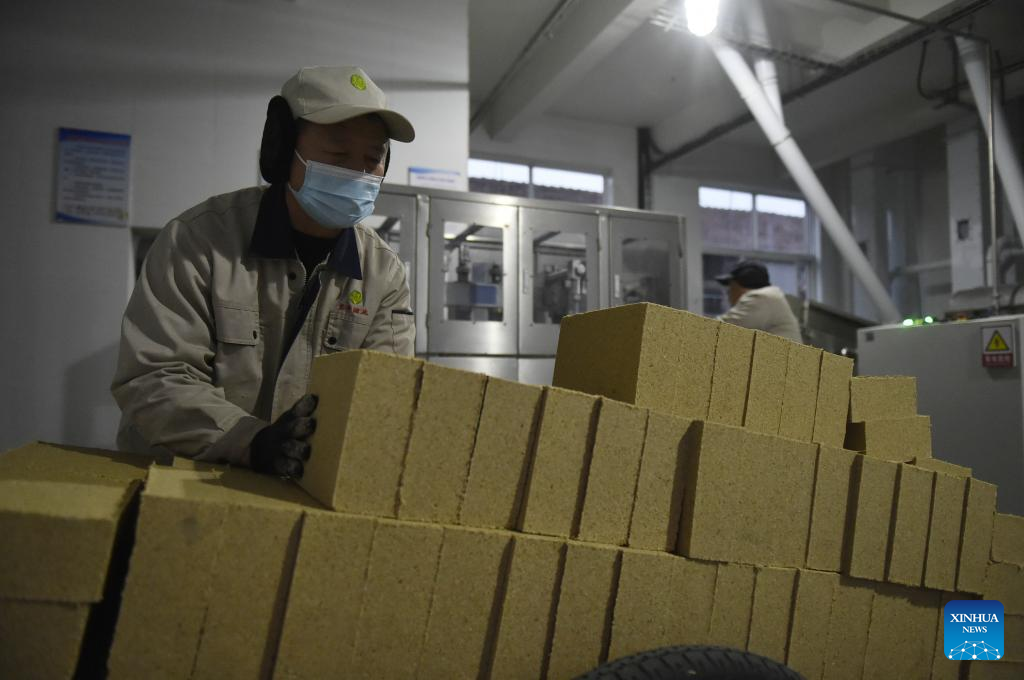A worker transports distiller's yeast at a workshop of Baofeng Baijiu Co., LTD in Baofeng County, central China's Henan Province, Dec. 21, 2023. (Xinhua/Lu Peng)