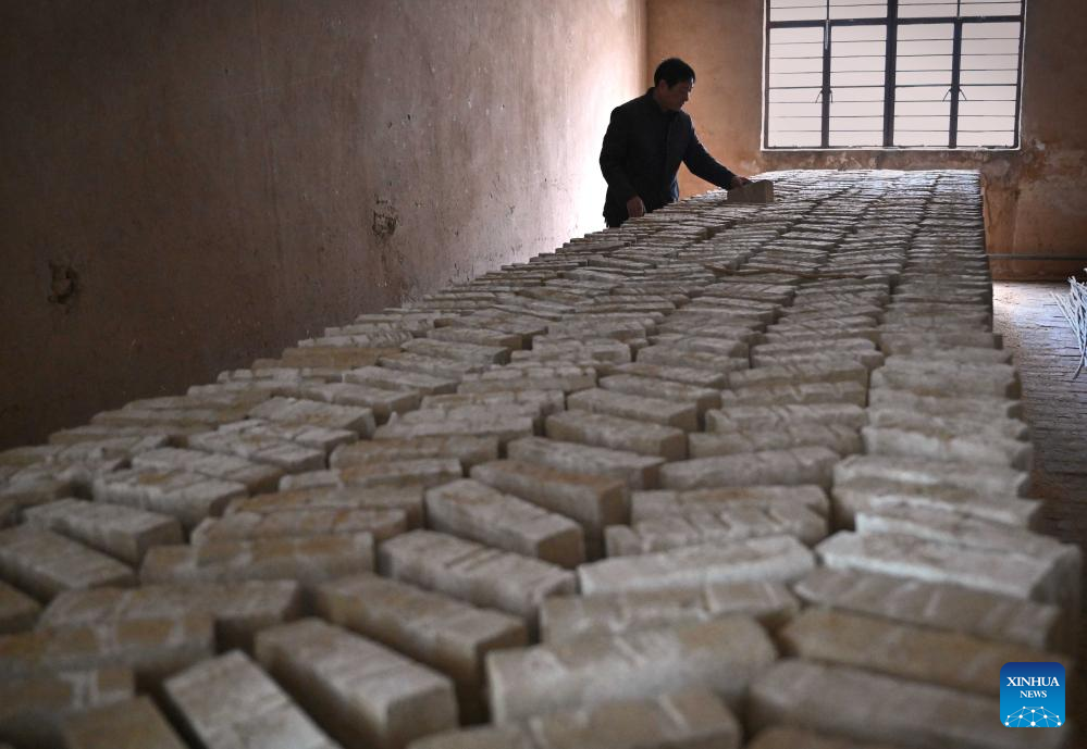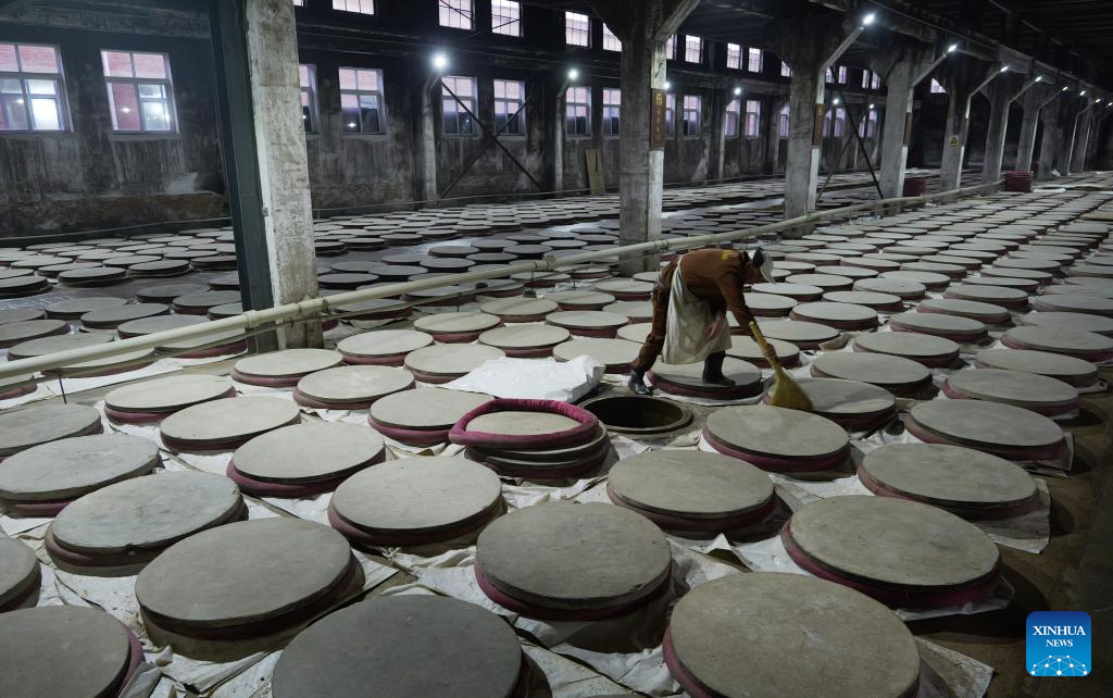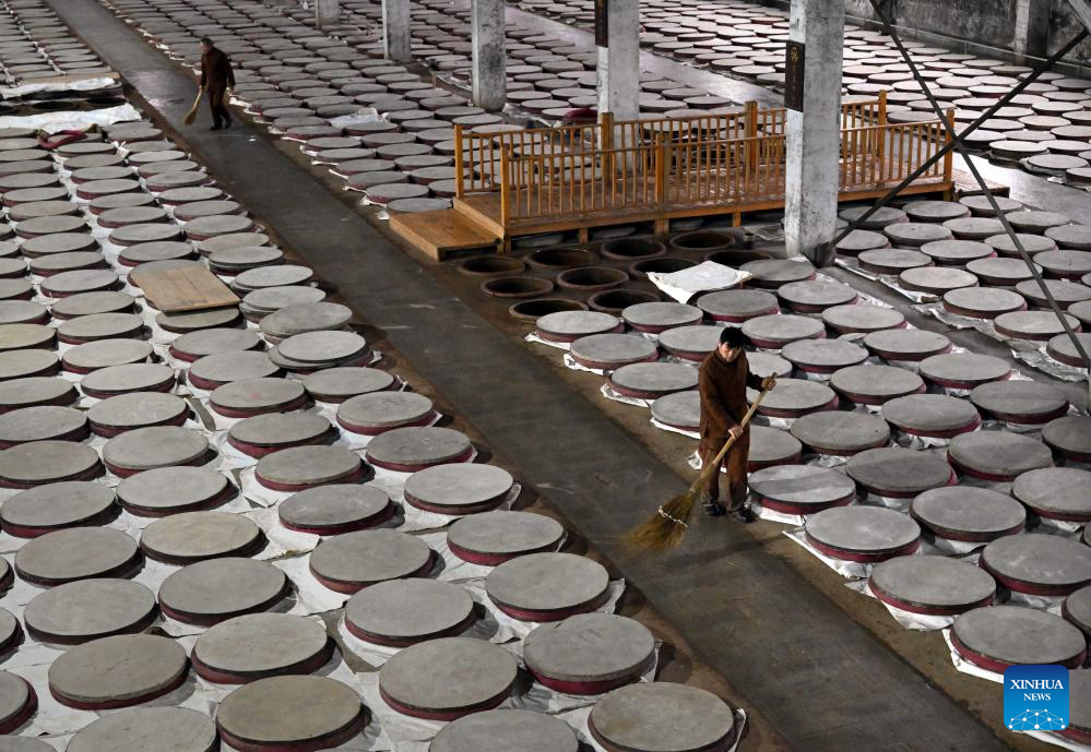 A worker checks the condition of distiller's yeast at a workshop of Baofeng Baijiu Co., LTD in Baofeng County, central China's Henan Province, Dec. 21, 2023. (Xinhua/Li An)