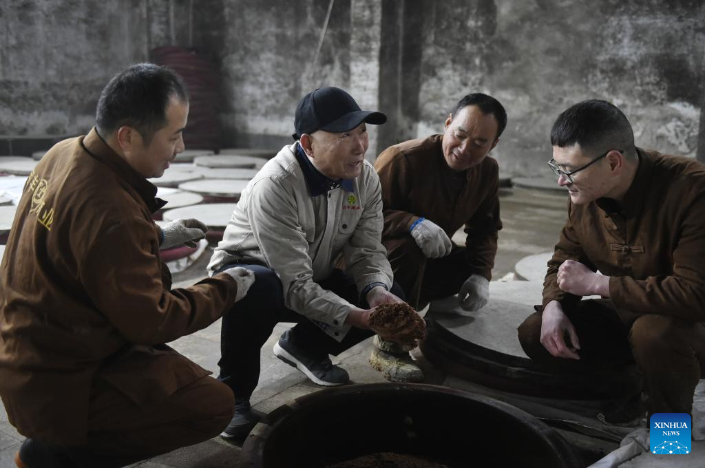 Lu Zhenying (2nd L), an inheritor of intangible cultural heritage, gives technical guidance to workers at a workshop of Baofeng Baijiu Co., LTD in Baofeng County, central China's Henan Province, Dec. 21, 2023. (Xinhua/Lu Peng)