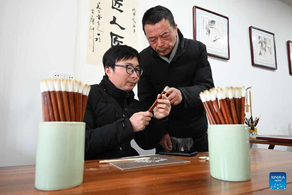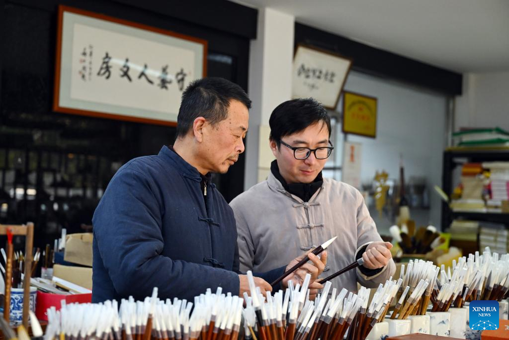 She Ji (R) checks the finished Xuan brushes with his father She Zhengjun in Jingxian County, east China's Anhui Province, Dec. 20, 2023. (Xinhua/Zhou Mu)