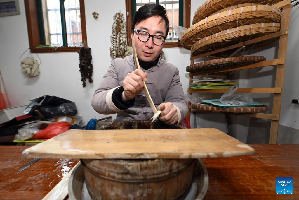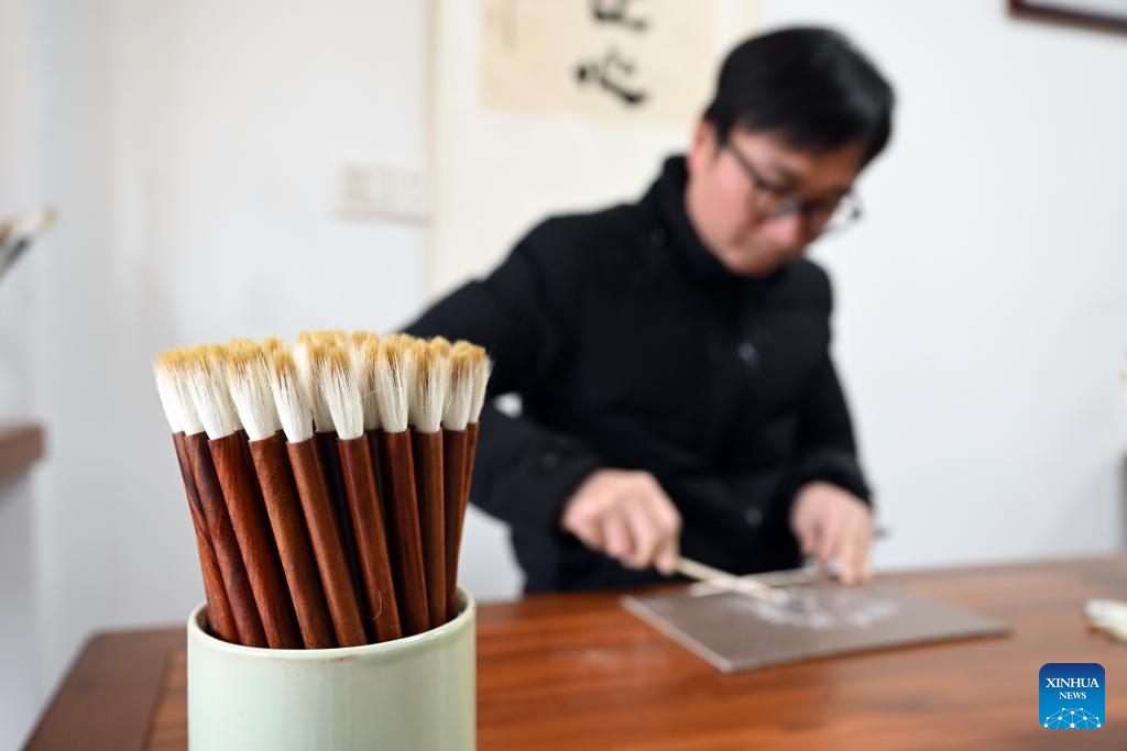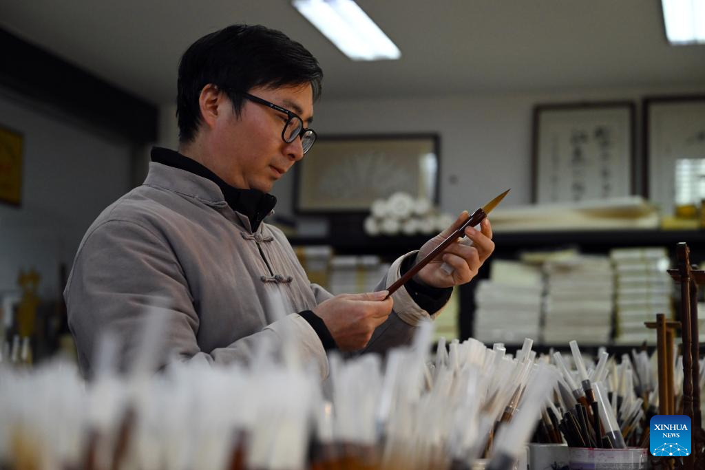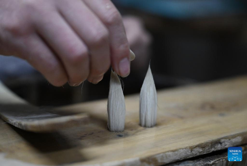 She Ji makes a Xuan brush in Jingxian County, east China's Anhui Province, Dec. 21, 2023. (Xinhua/Zhou Mu)