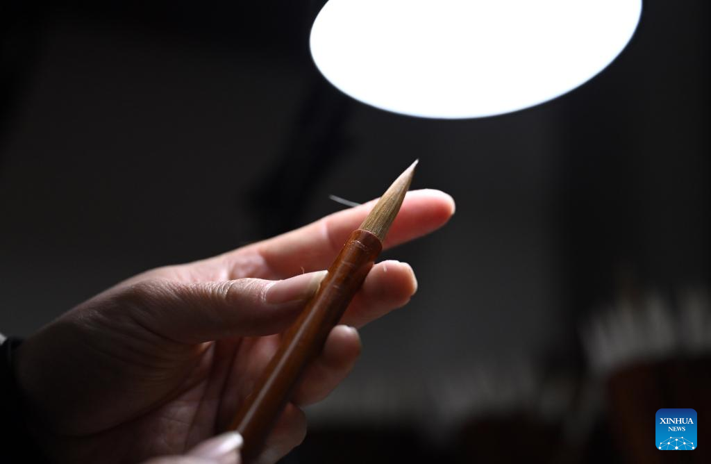 She Ji checks a finished Xuan brush in Jingxian County, east China's Anhui Province, Dec. 20, 2023. (Xinhua/Zhou Mu)