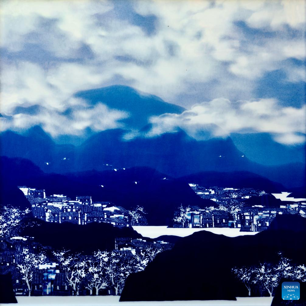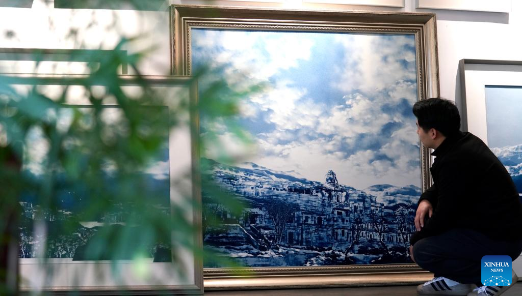 This photo taken on Dec. 14, 2023 shows a blue and white porcelain painting created by Luo Xiaocong. Luo Xiaocong, a 59-year-old professor at Jingdezhen Ceramic University, has been dedicated to modern porcelain painting for years. (Xinhua/Hu Chenhuan)