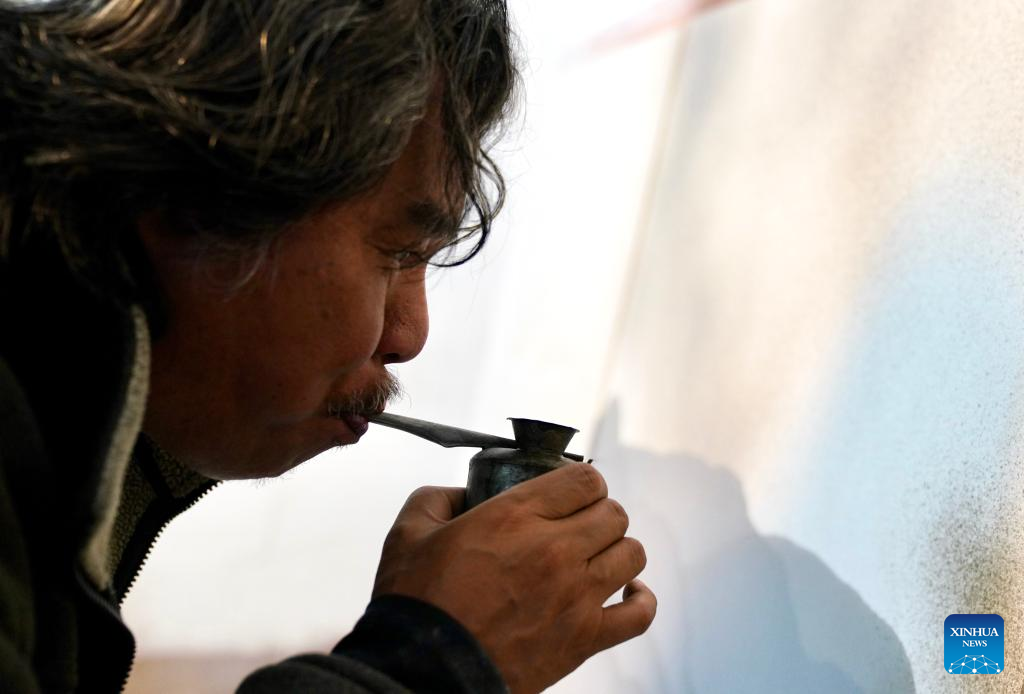 Luo Xiaocong blows glaze to his artwork at his studio in Jingdezhen, east China's Jiangxi Province, Dec. 14, 2023. (Xinhua/Hu Chenhuan)