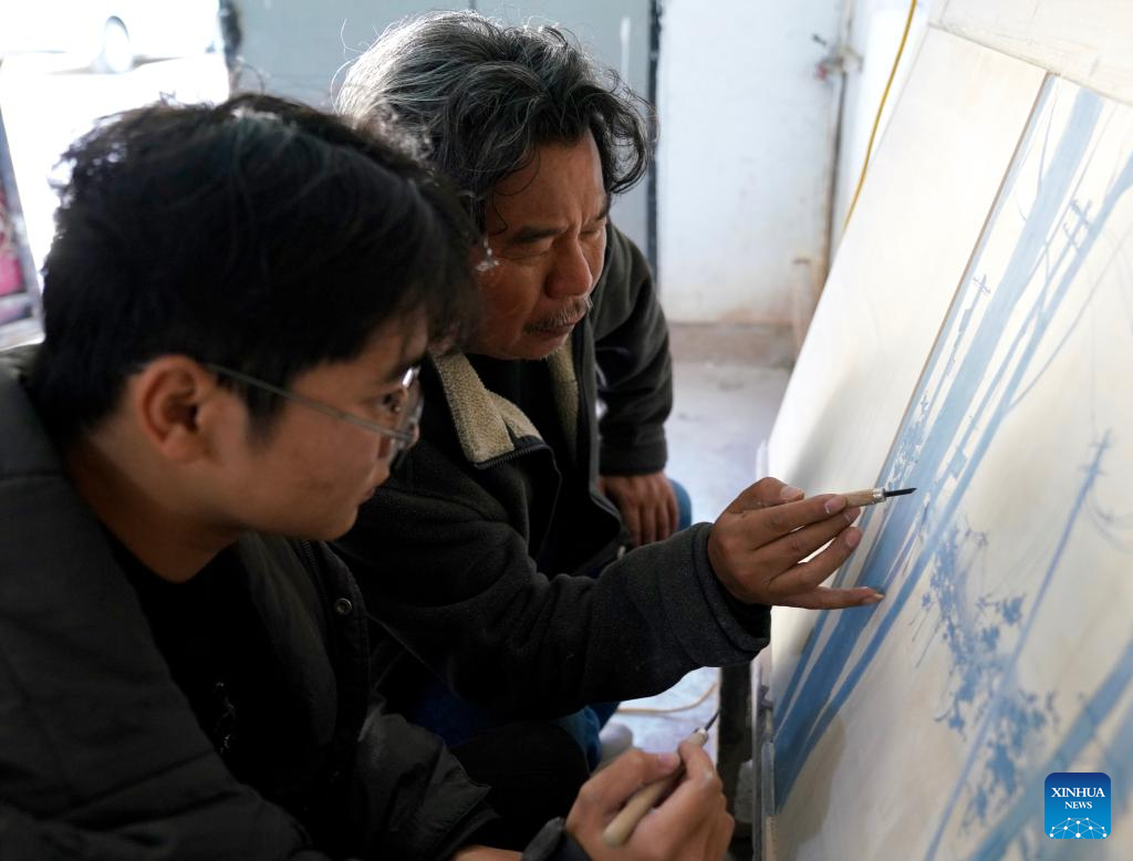 Luo Xiaocong (rear) instructs a student at his studio in Jingdezhen, east China's Jiangxi Province, Dec. 14, 2023. (Xinhua/Hu Chenhuan)