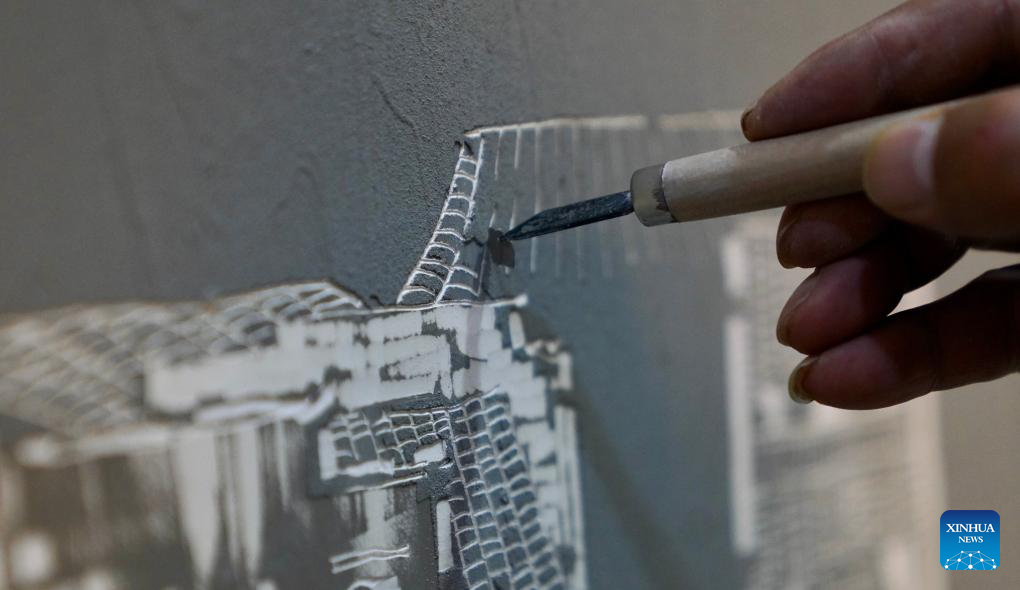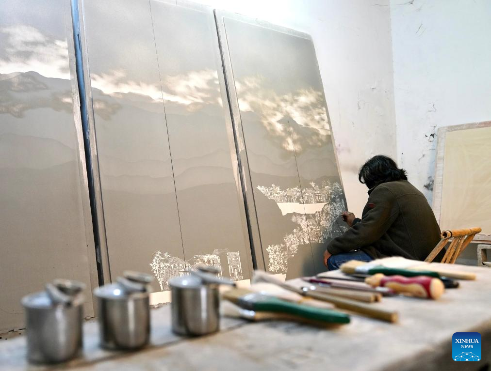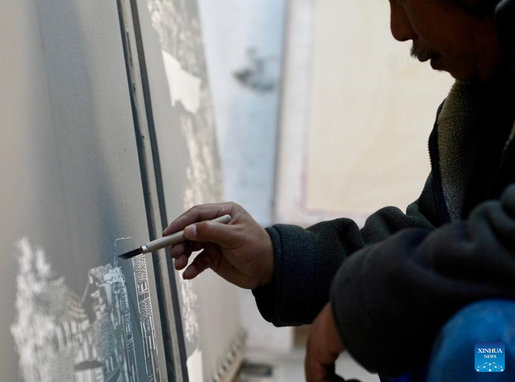 Luo Xiaocong creates with a graver at his studio in Jingdezhen, east China's Jiangxi Province, Dec. 14, 2023. (Xinhua/Hu Chenhuan)