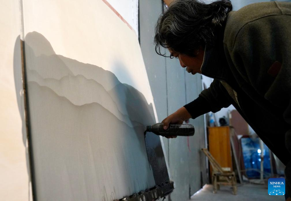 Luo Xiaocong splashes blue pigment on a clay base at his studio in Jingdezhen, east China's Jiangxi Province, Dec. 14, 2023. (Xinhua/Hu Chenhuan)