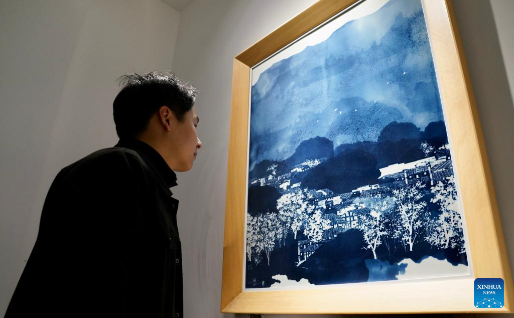A visitor looks at a blue and white porcelain painting at Luo Xiaocong's gallery in Jingdezhen, east China's Jiangxi Province, Dec. 14, 2023. (Xinhua/Hu Chenhuan)
