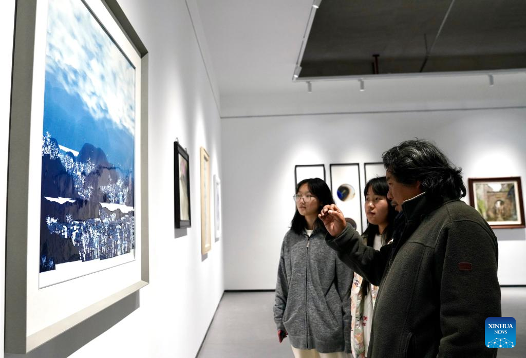 Luo Xiaocong (R) shares his work with students at an exhibition hall of Jingdezhen Ceramic University in Jingdezhen, east China's Jiangxi Province, Dec. 14, 2023. (Xinhua/Hu Chenhuan)