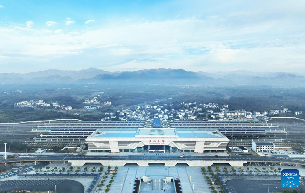 This aerial photo taken on Dec. 26, 2023 shows Huangshan North Station of Hangzhou-Nanchang high-speed railway in Huangshan City, east China's Anhui Province. Huangshan to Nanchang section of Hangzhou-Nanchang high-speed railway will start operation on Dec. 27, marking the full operation of the Hangzhou-Nanchang high-speed railway. (Xinhua/Xing Guangli)
