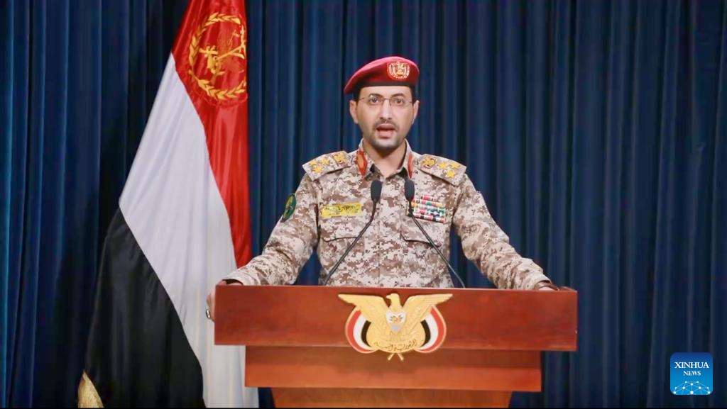 The screenshot captured from a video released by the Houthi group on Dec. 26, 2023 shows Houthi military spokesman Yahya Sarea making a statement in Sanaa, Yemen. Yemen's Houthi rebels on Tuesday claimed responsibility for fresh attacks on a commercial ship in the Red Sea and on the Israeli city of Eilat in the northern part of the Red Sea. (Xinhua)