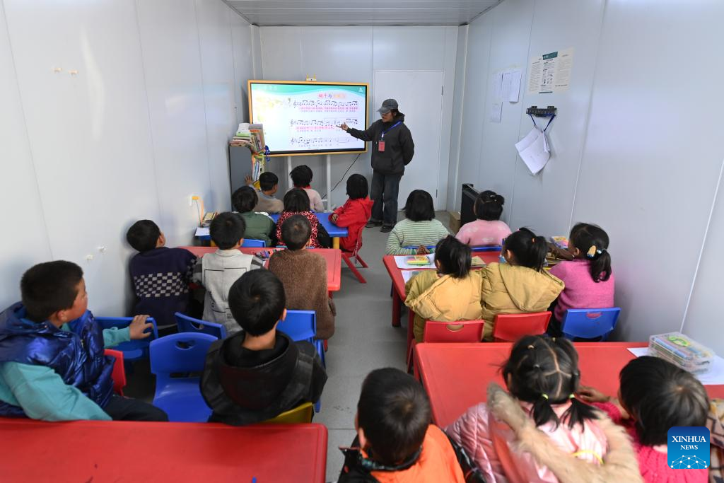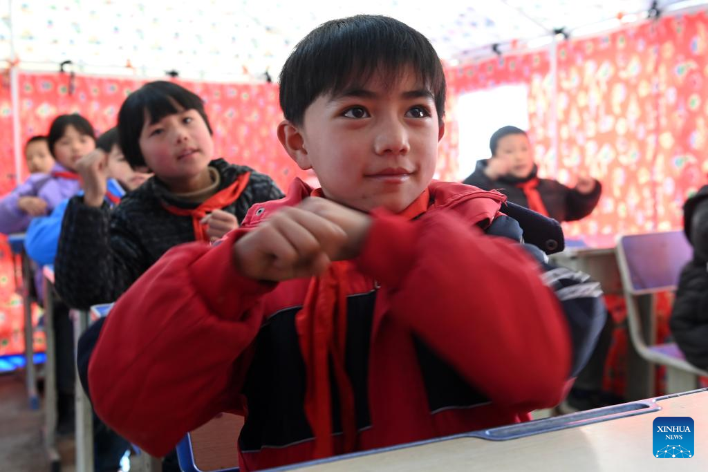 Students attend class at a temporary classroom in Liugou Town of the Bonan-Dongxiang-Salar Autonomous County of Jishishan, northwest China's Gansu Province, Dec. 27, 2023. Combining online and offline teaching, local primary and secondary schools in Jishishan County resumed classes this week. More than 150 temporary teaching sites started classes. (Xinhua/Fan Peishen)