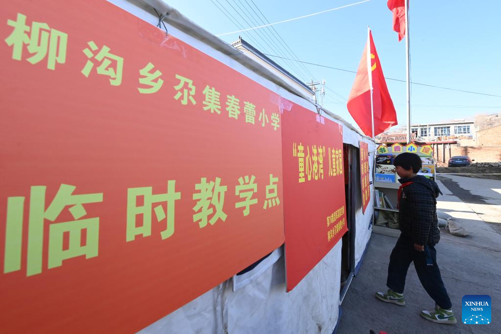 A student walks into a temporary classroom in Liugou Town of the Bonan-Dongxiang-Salar Autonomous County of Jishishan, northwest China's Gansu Province, Dec. 27, 2023. Combining online and offline teaching, local primary and secondary schools in Jishishan County resumed classes this week. More than 150 temporary teaching sites started classes. (Xinhua/Fan Peishen)