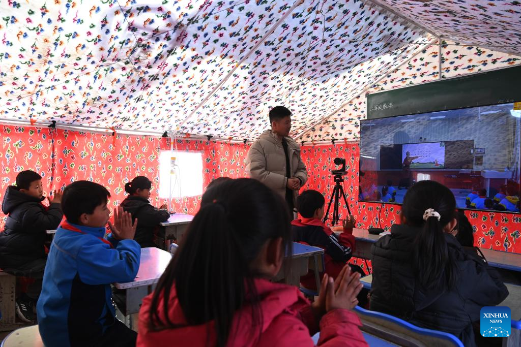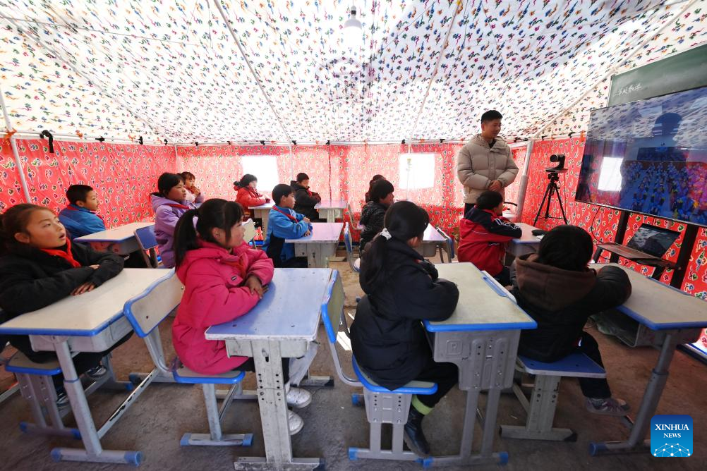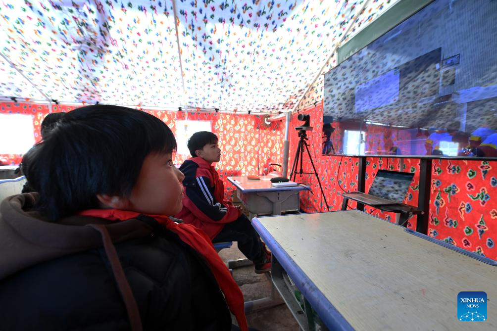 Students attend class at a temporary classroom in Dahejia Town of the Bonan-Dongxiang-Salar Autonomous County of Jishishan, northwest China's Gansu Province, Dec. 27, 2023. Combining online and offline teaching, local primary and secondary schools in Jishishan County resumed classes this week. More than 150 temporary teaching sites started classes. (Xinhua/Fan Peishen)