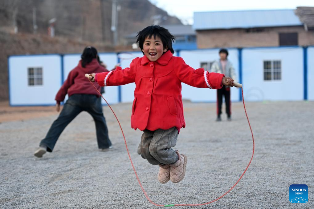 Students jump rope at a temporary playground in Dahejia Town of the Bonan-Dongxiang-Salar Autonomous County of Jishishan, northwest China's Gansu Province, Dec. 27, 2023. Combining online and offline teaching, local primary and secondary schools in Jishishan County resumed classes this week. More than 150 temporary teaching sites started classes. (Xinhua/Fan Peishen)