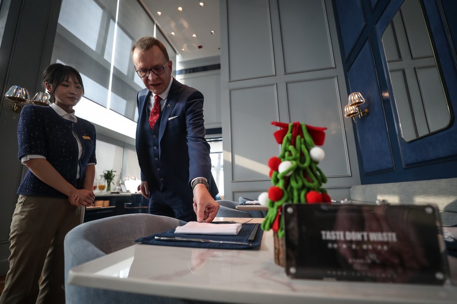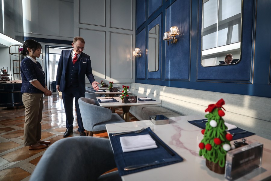 Erich Kaiserseder from Austria (R), general manager of Conrad Shenyang, talks with his colleague at the hotel's restaurant in Shenyang, northeast China's Liaoning Province, Dec. 19, 2023. (Xinhua/Pan Yulong)