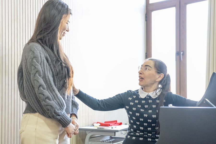 Russian pianist Olga talks with a student at a classroom of Harbin Conservatory of Music in Harbin, northeast China's Heilongjiang Province, Dec. 21, 2023. (Xinhua/Xie Jianfei)