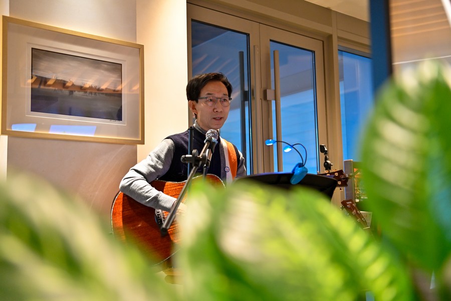 Woo Kyong-Jei, a South Korean barista, plays the guitar at a cafe in Changchun, northeast China's Jilin Province, Dec. 27, 2023. (Xinhua/Yan Linyun)