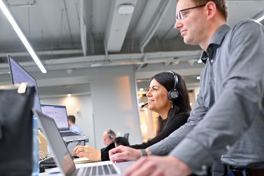 German engineers Sascha Schuerrer (R) and his wife Johanna Garzon-Schuerrer work at an office in Audi FAW NEV Co., Ltd. in Changchun, northeast China's Jilin Province, Nov. 24, 2023. (Xinhua/Yan Linyun)